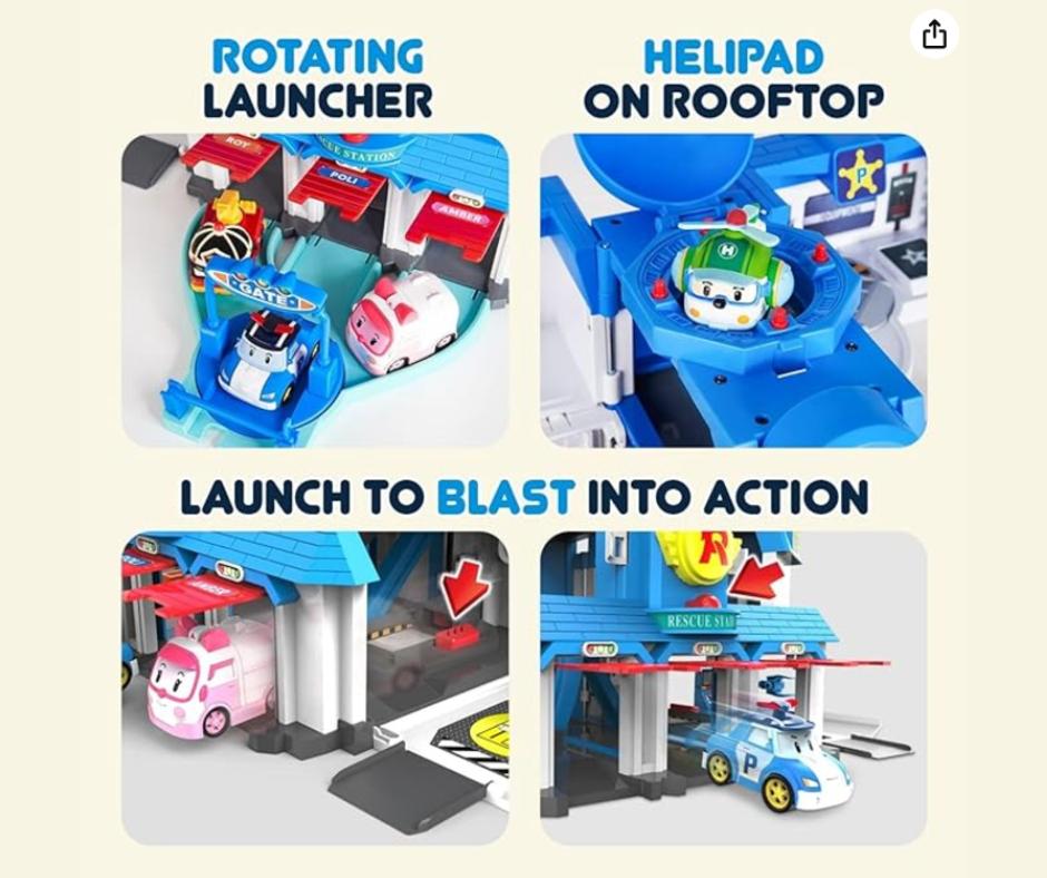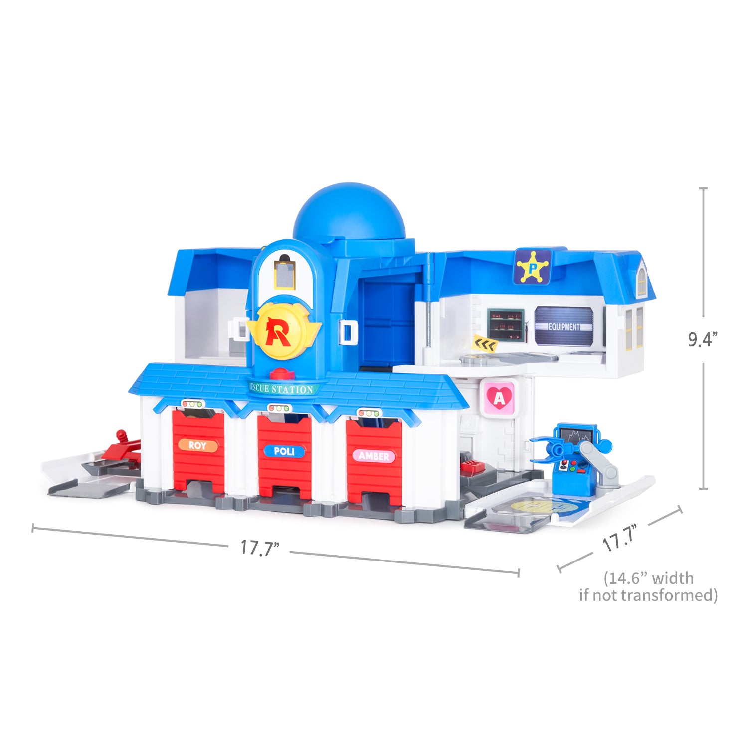 - TRANSFORMABLE RESCUE STATION CENTER: Kids can explore their imaginations as they create all kinds of fun and exciting rescue missions for Robocar rescue team and broomstown friends vehicles. It transforms and opens up into a command center. Transforming headquarter with different featured zone - Car repair shop, Jin control centre, Die-cast launcher, Slider for die-cast to slide down from 2nd floor to the gate, Helipad on rooftop for Helly.