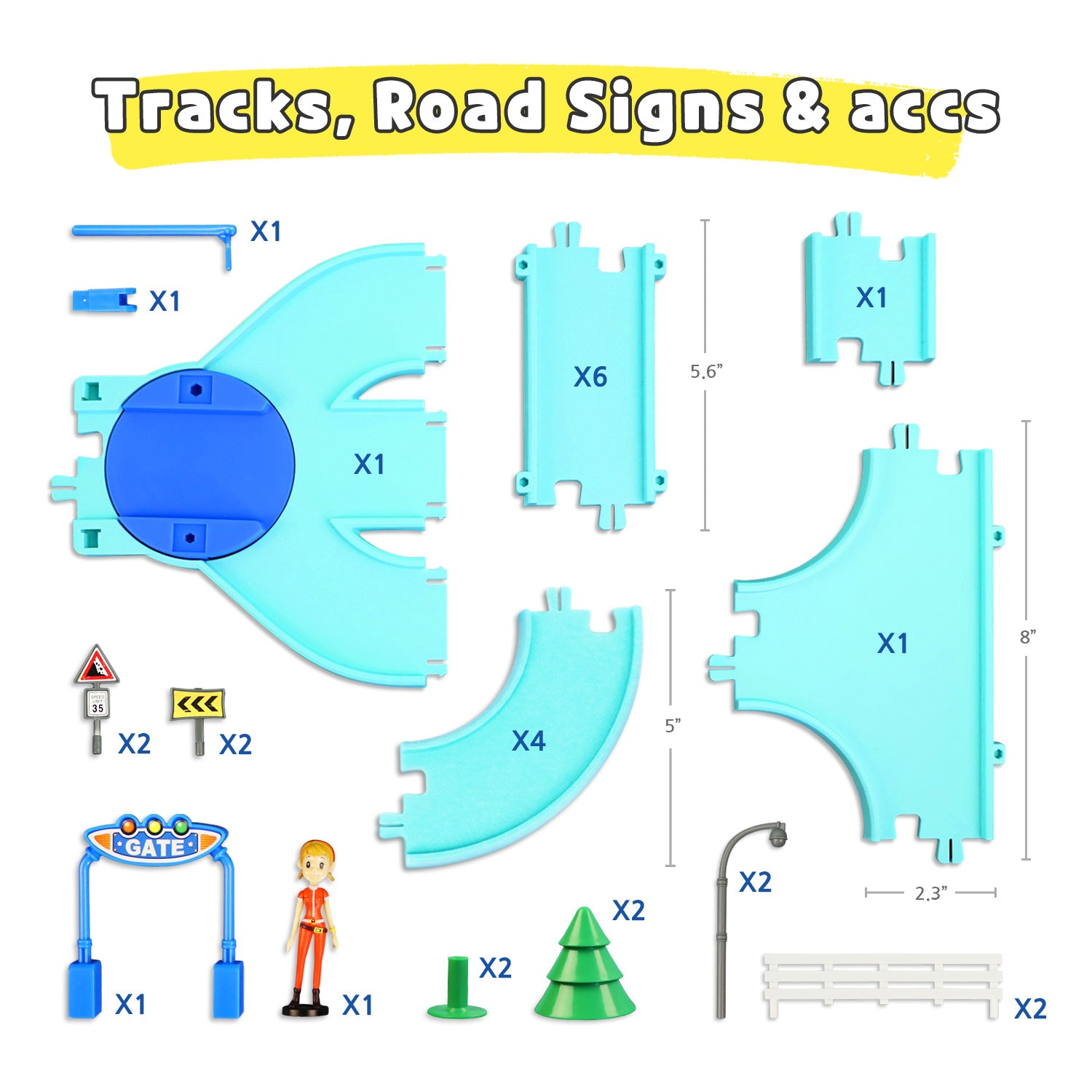 - Includes: 1 Transforming Rescue Center, Rail Track Set (12 Tracks, 15 pcs accessories including road sign, 1 Rotating vehicle launcher), 1 Jin Figurine, 1 Sticker Sheet, 1 Instruction Guide