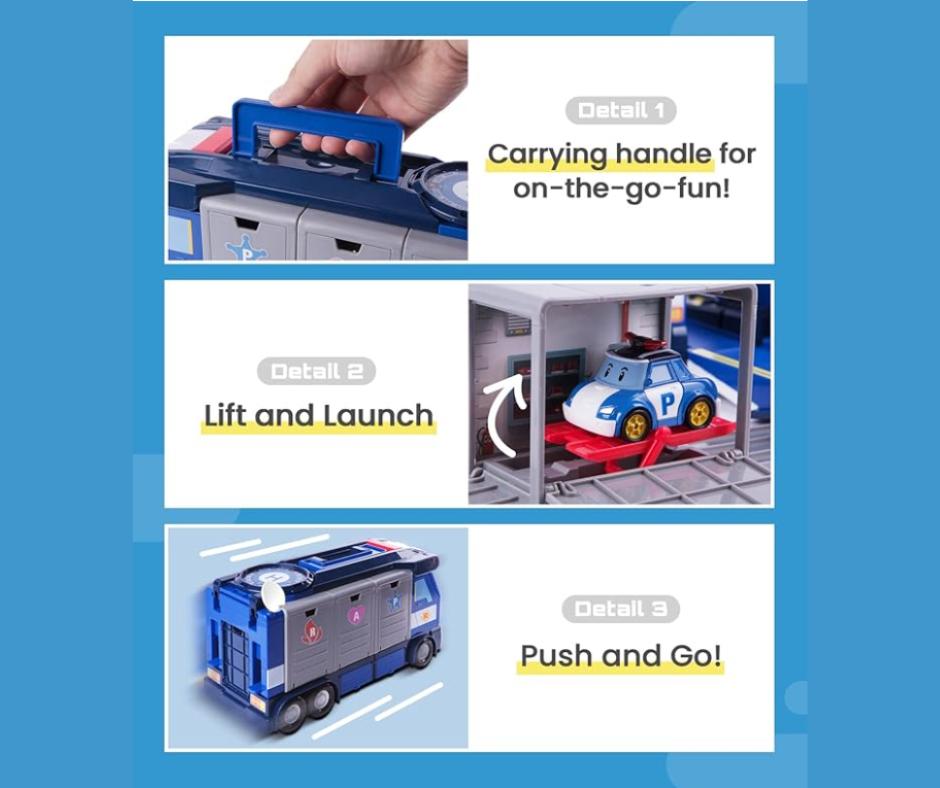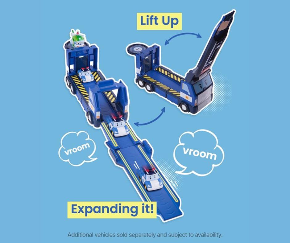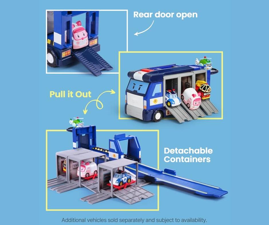 - PORTABLE VEHICLE CARRIER: Robocar POLI Mobile HQ Truck is the rescue truck and can transport 3 Poli's die-cast vehicle toys inside and 1 vehicle on the platform. Easy to carry with a handle on the top.